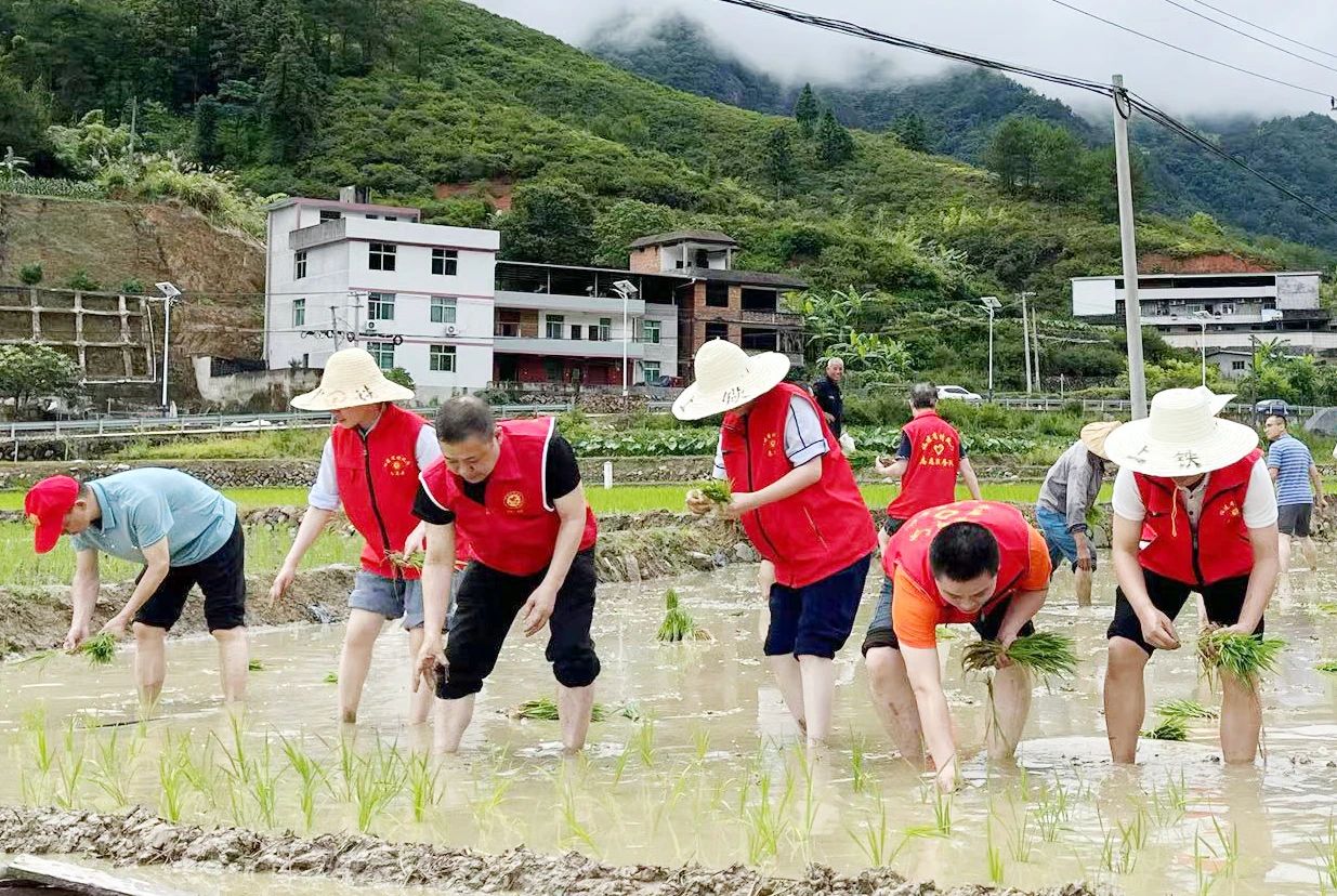 蓑下清风笠下烟,手把青秧插满田。6月9日,芒种刚过,一批财政党员干部来到闽清县三溪乡溪源村,开展“我在乡间有亩田”主题党日暨党员志愿活动。大家头戴斗笠,高卷裤脚,左提苗、右插秧,一步一脚印忙碌在稻田中。骄阳烘托热情,泥泞孕育希望,一番持续劳作,脚下的水田已是秧苗成行、一派生机。