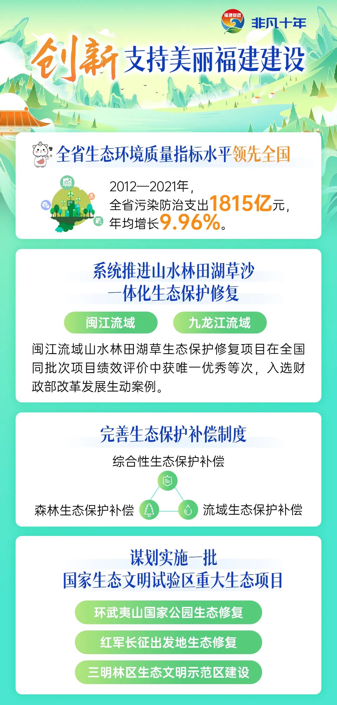 在习近平生态文明思想指导下,我省财政充分发挥政策、资金、管理作用,加快推进绿色发展。特别是党的十八大以来,借助被列入首个国家生态文明试验区的契机,进一步聚力系统治理、聚力精准治污、聚力机制创新,生态文明建设再上新台阶、取得新成效,美丽福建建设成色更足。