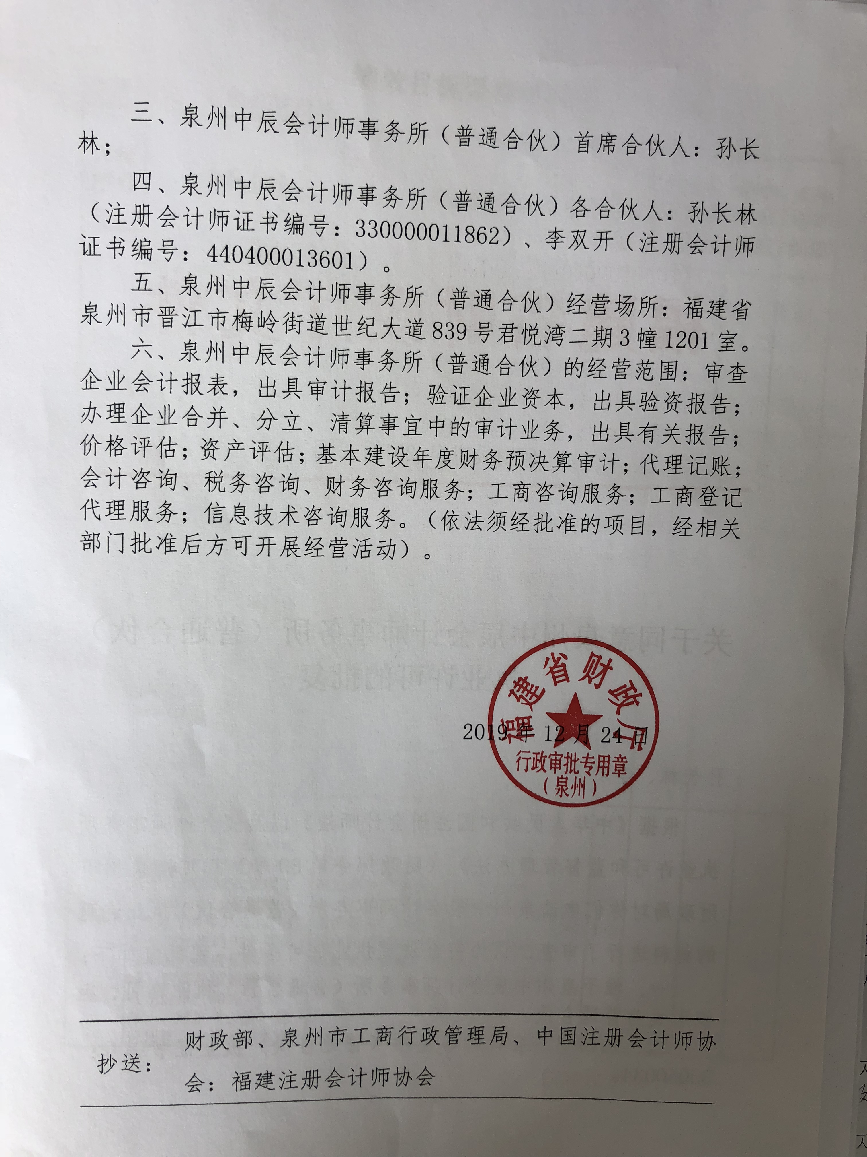 关于同意泉州中辰会计师事务所(普通合伙)执业许可的批复