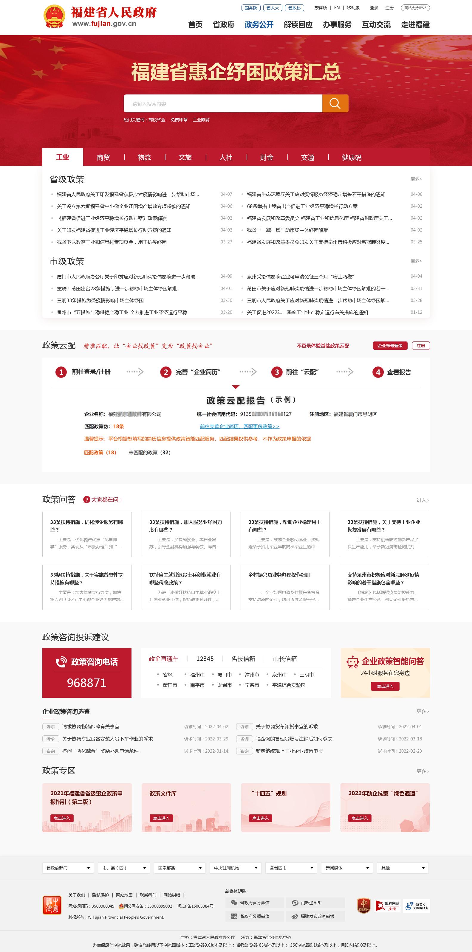 专栏汇总了工业、商贸、物流、文旅、人社、财金、交通等领域政策措施,包含了省、市两级政策,内容涵盖“33条措施”、“六税两费”减免、支持泉州市积极应对新冠肺炎疫情影响若干措施等。同时,还提供政策云配、政策咨询等在线服务。其中,政策云配方面,通过完善“企业简历”,提供政策智能匹配服务,让“企业找政策”变为“政策找企业”;政策咨询方面,企业可拨打“968871”或在线提交诉求。