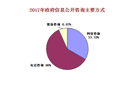(五)政府信息公开咨询情况。2017年共有15人次通过各种方式咨询政府信息公开有关事务,其中网络咨询5人次,占33.33%,电话咨询9人次,占60%,现场咨询1人次,占6.67 %,咨询内容涉及信息公开程序、渠道等。